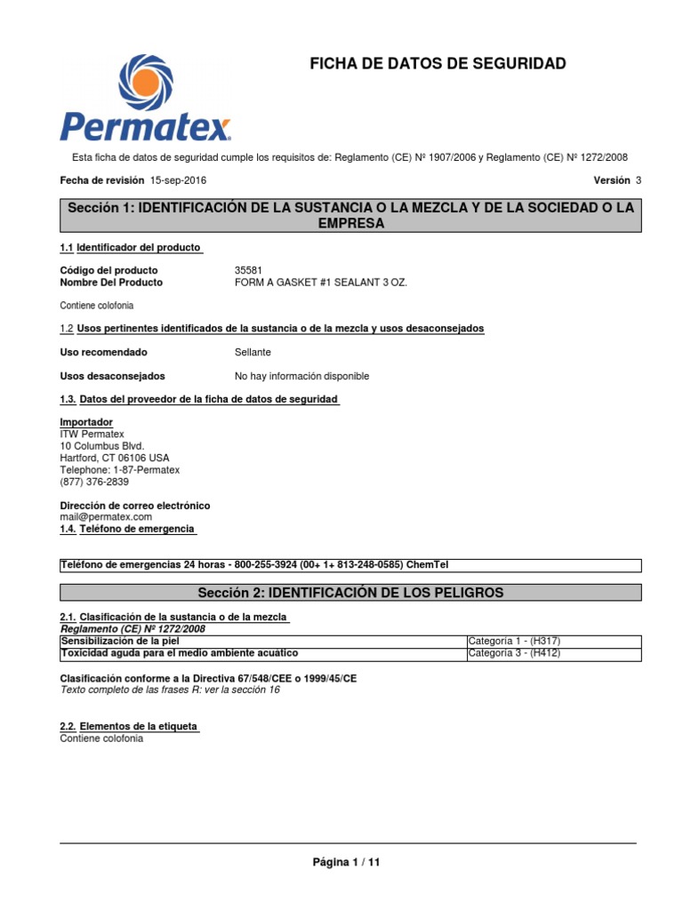 Permatex Gasket Nro1 MSDS Spanish PDF Toxicidad Solubilidad
